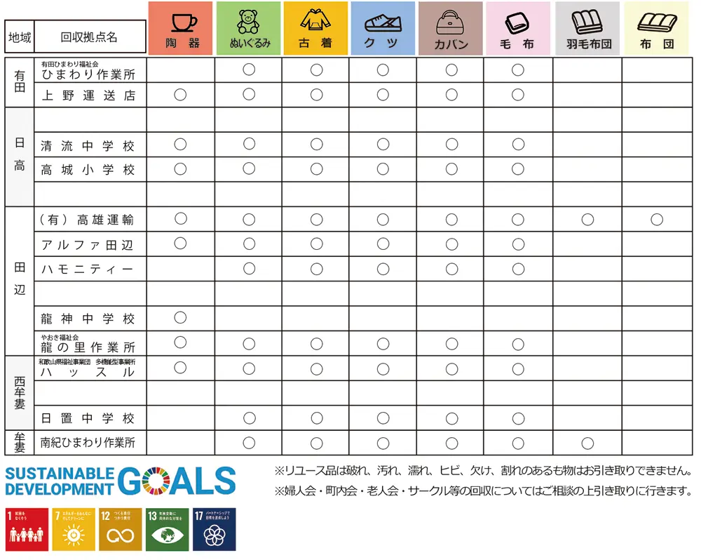 無料回収拠点と回収可能品一覧